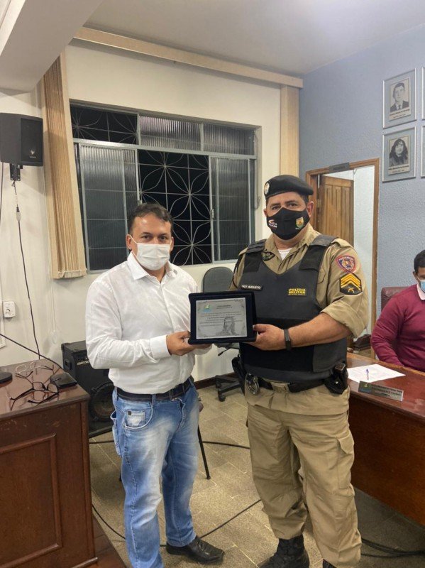 Durante a reunião desta terça-feira (15/6), o presidente Gustavo Luís Martins Garcia procedeu à entrega de honraria policial destaque do ano pela câmara municipal de Córrego Danta. De autoria do presidente Gustavo, a honraria policial destaque do ano foi instituída pela resolução nº. 175, de 27 de março de 2018 e busca homenagear anualmente um policial que se destacou em seus afazeres durante o ano.